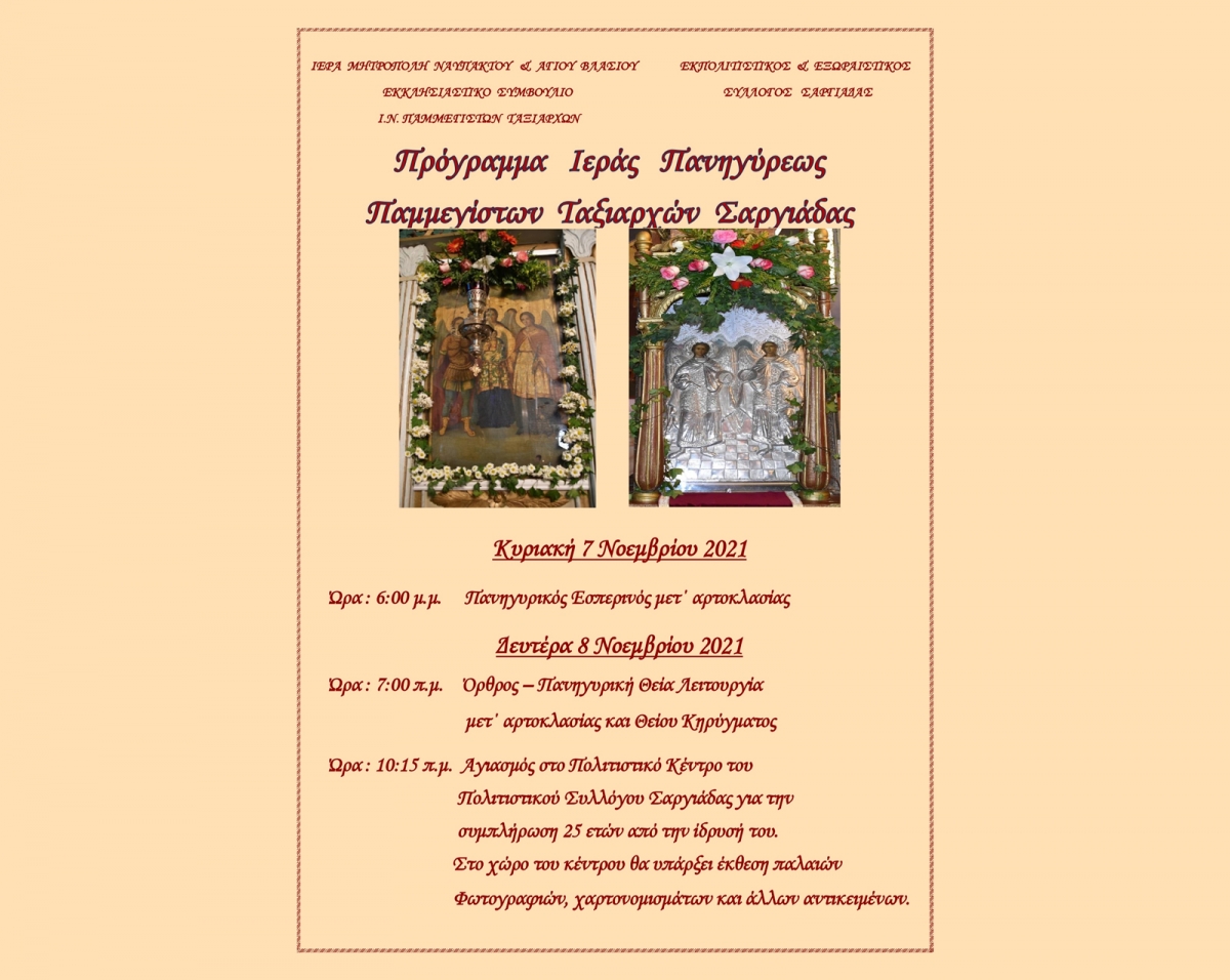 Πρόγραμμα Ιεράς ΠανηγύρεωςΠαμμεγίστων Ταξιαρχών Σαργιάδας