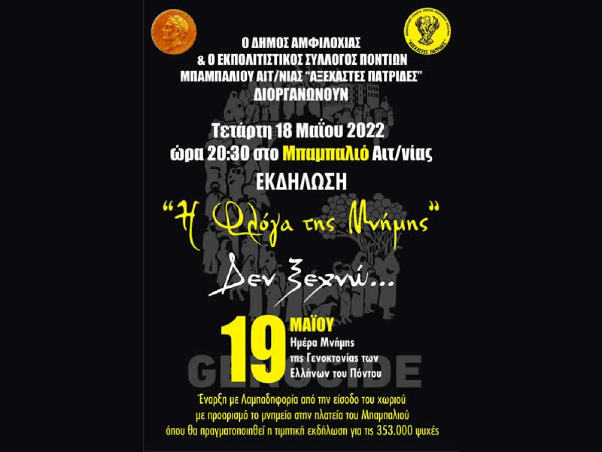 Ο Δήμος Αμφιλοχίας, μέλος του Δικτύου Πόλεων με Ποντιακές Κοινότητες, τιμά την Ημέρα Μνήμης της Γενοκτονίας του Ποντιακού Ελληνισμού και συμμετέχει στην εκδήλωση «Η Φλόγα της Μνήμης» που συνδιοργανώνεται με τον Εκπολιτιστικό Σύλλογο Ποντίων Μπαμπαλιού Αιτωλοακαρνανίας «Αξέχαστες Πατρίδες».