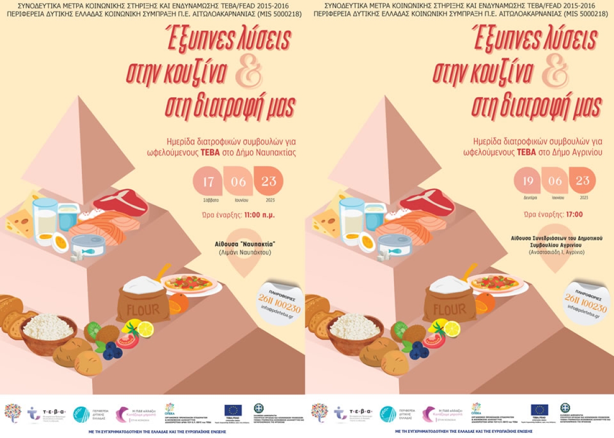 - Το Σάββατο 17 Ιουνίου 2023 και ώρα 11 π.μ στο Δήμο Ναυπακτίας, θα πραγματοποιηθεί ημερίδα στην Αίθουσα «Ναυπακτία» στο λιμάνι της Ναυπάκτουστο πλαίσιο υλοποίησης των Συνοδευτικών Μέτρων του ΕΠ ΕΒΥΣ Ι του ΤΕΒΑ 2015-2016. Σκοπός της ημερίδας αυτής, είναι να αποτελέσει οδηγό για μια καλύτερη διατροφική συμπεριφορά, τονίζοντας τη σημασία και τα θετικά οφέλη της υγιεινής διατροφής για όλους.